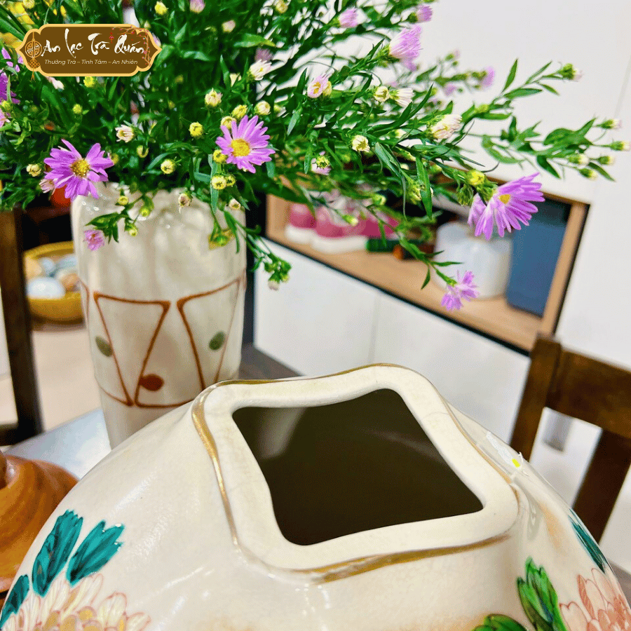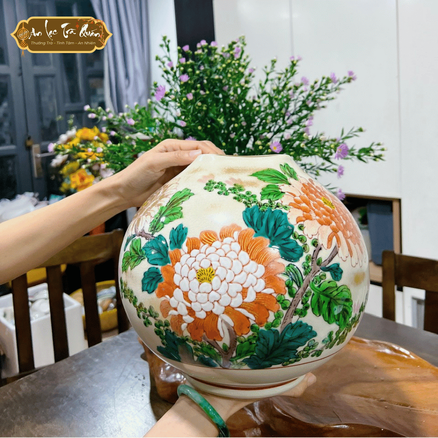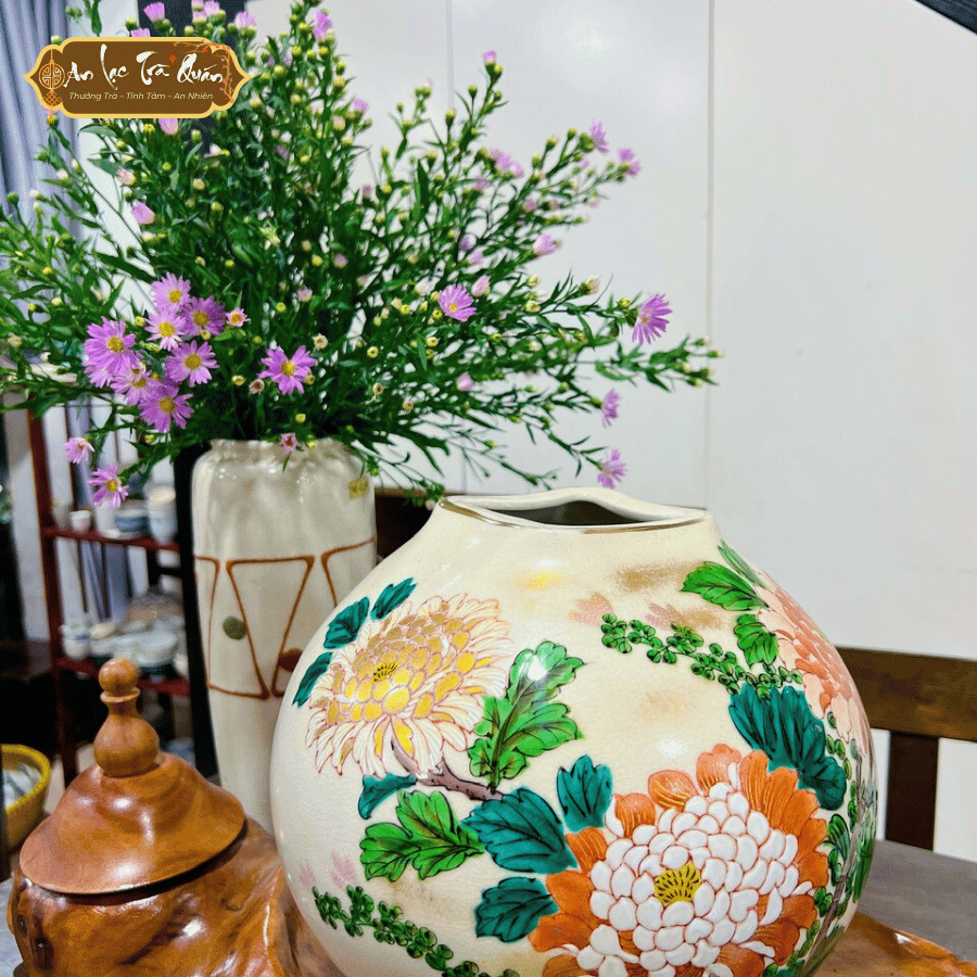Bình Cúc Nguyệt Viên là một tuyệt phẩm gốm sứ mang dáng tròn đầy như ánh trăng, kết hợp cùng họa tiết hoa cúc cam – trắng nổi bật trên nền men ngà. Từng nét vẽ được chế tác thủ công tinh tế, mang lại vẻ đẹp cổ điển, sang trọng nhưng vẫn gần gũi.