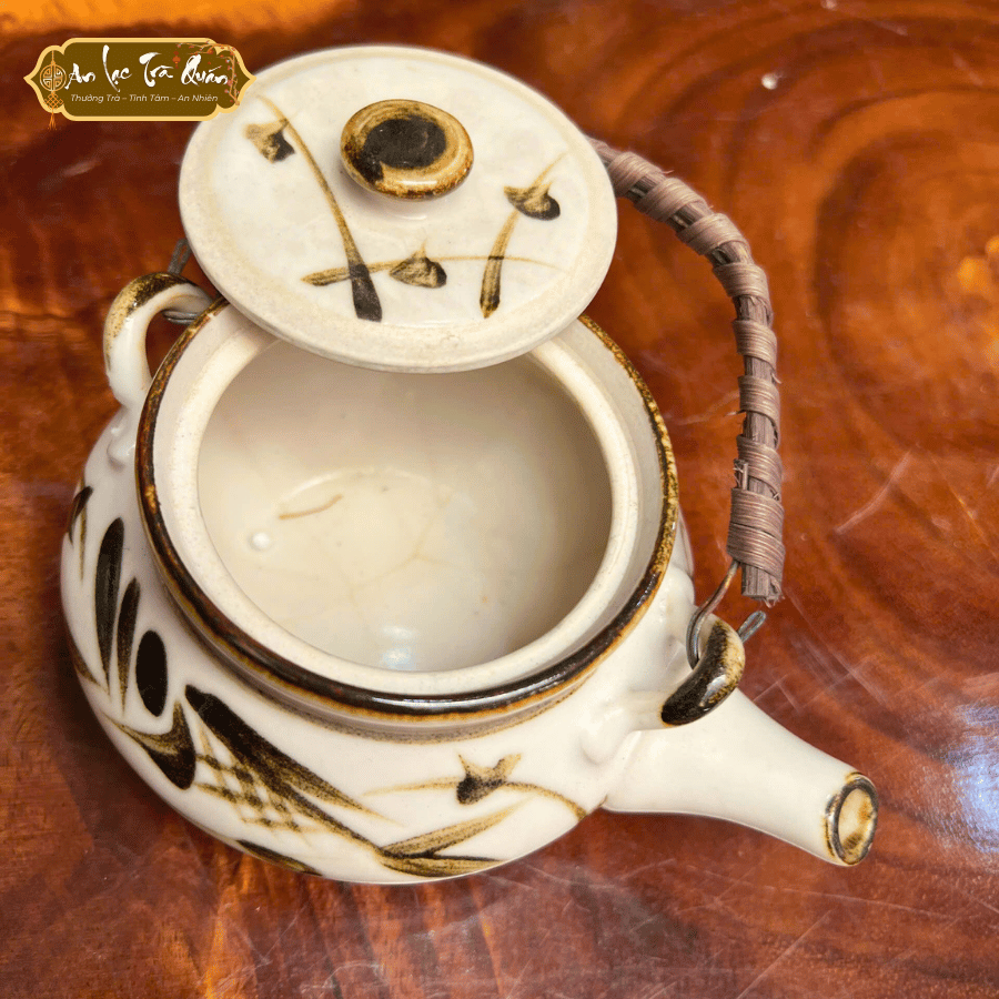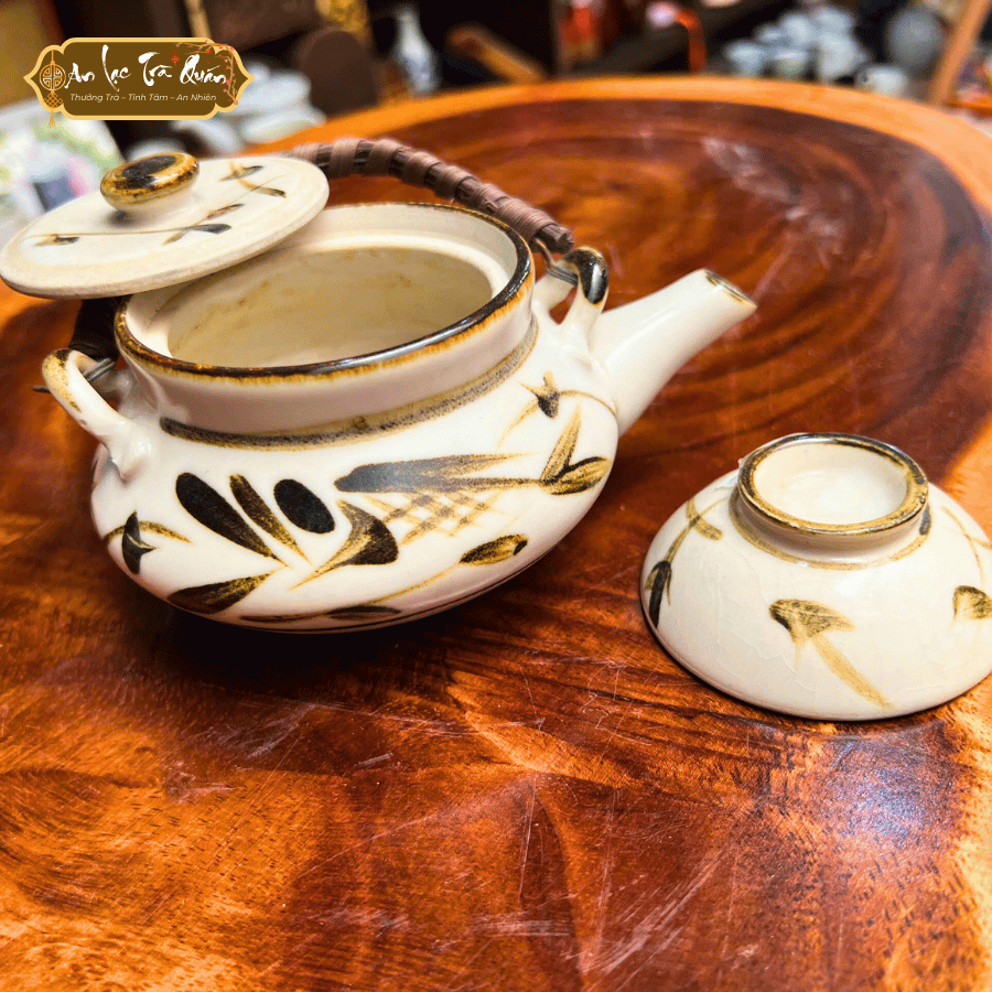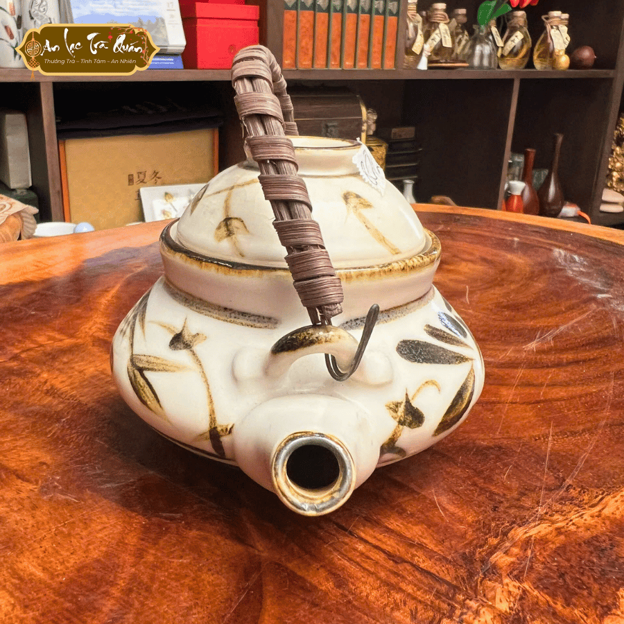Bộ bình Mộc Diệp là sự kết hợp hoàn hảo giữa nét cổ điển và tinh thần mộc mạc. Với dáng bình tròn thấp, quai mây đan tay tỉ mỉ và lớp men ngà điểm họa tiết lá mềm mại, sản phẩm mang đến cảm giác gần gũi, an yên.