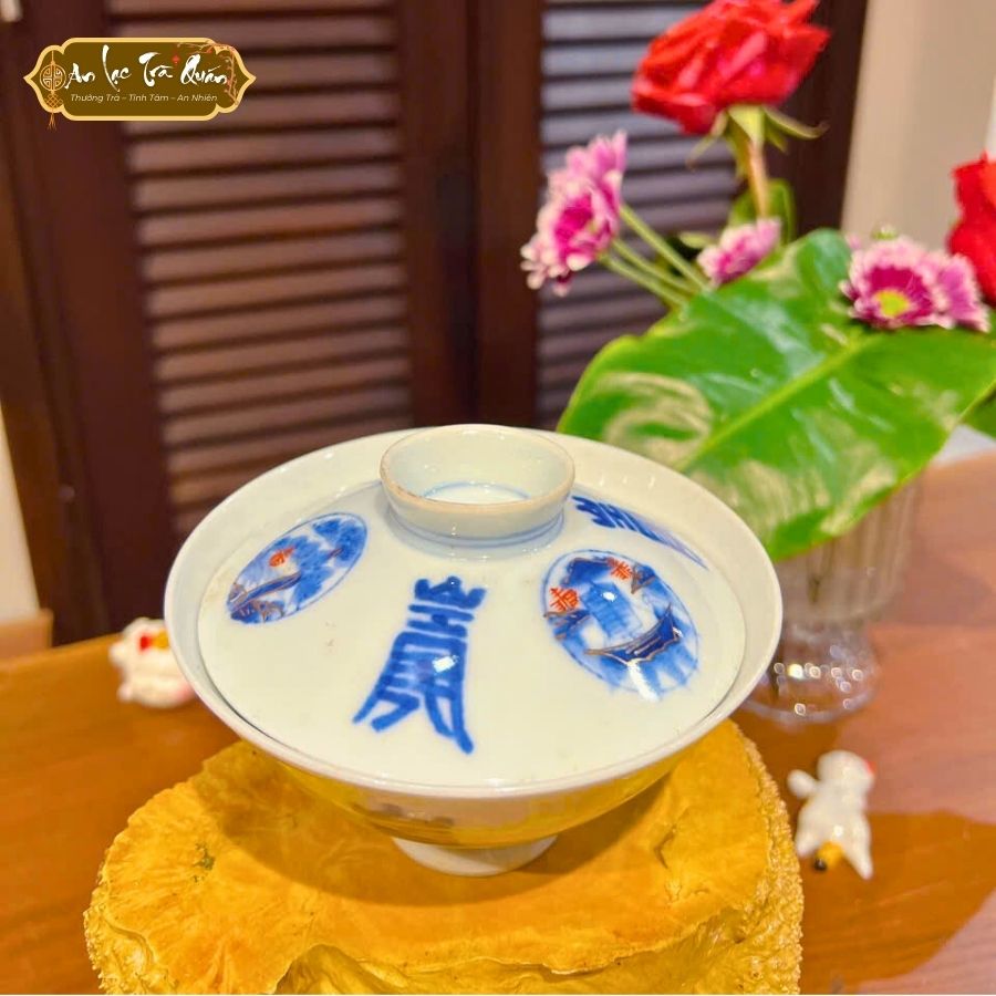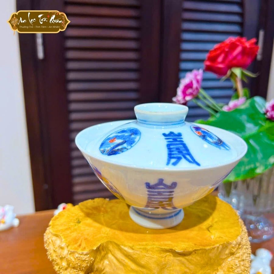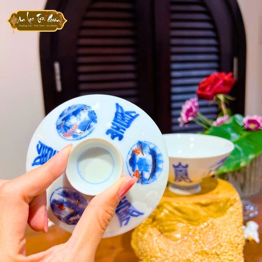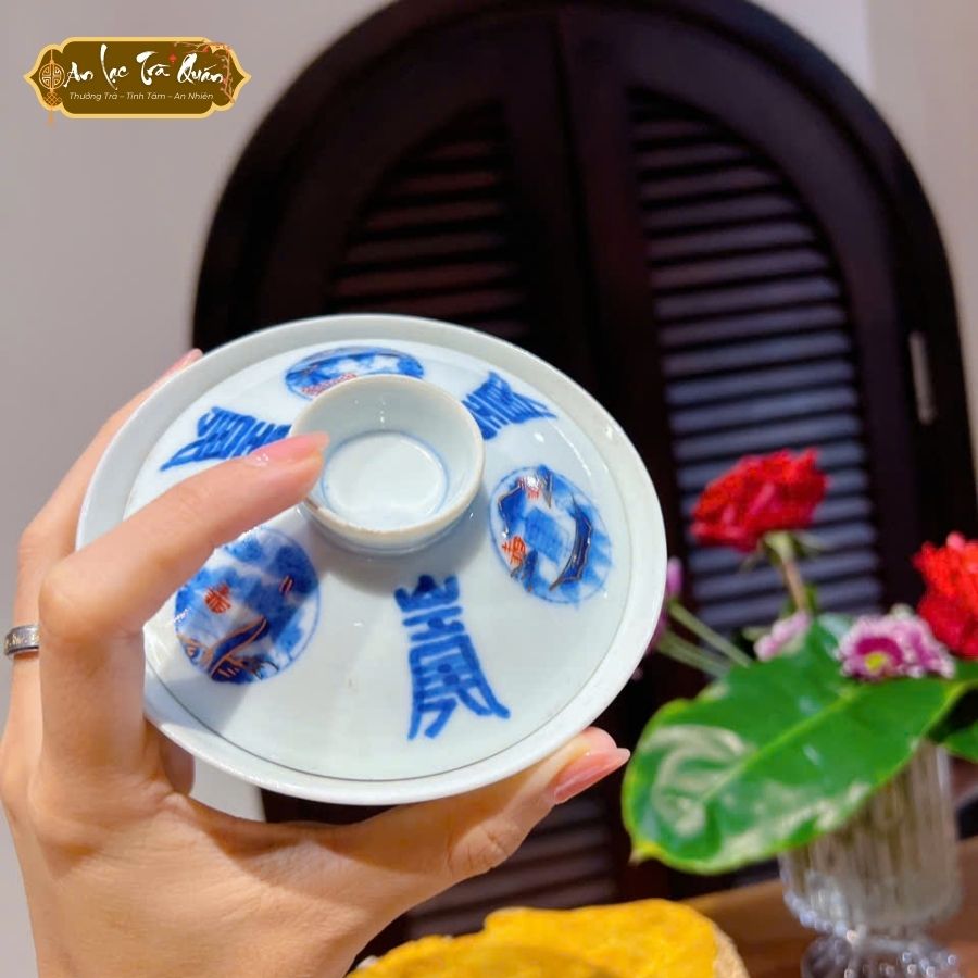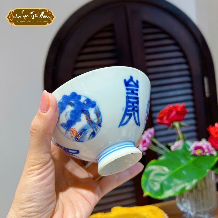 Họa tiết: Chữ Hán xanh lam và nét vẽ cổ điển, tạo sự trang nhã.
