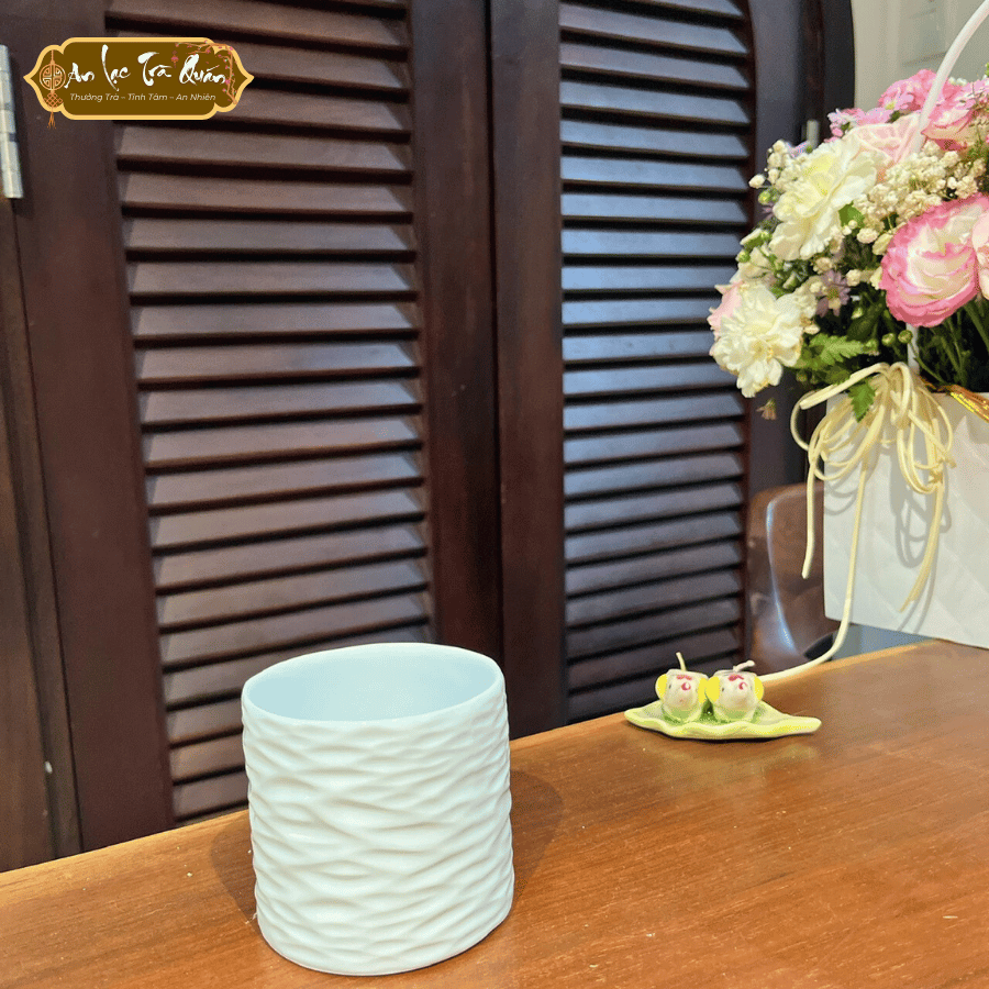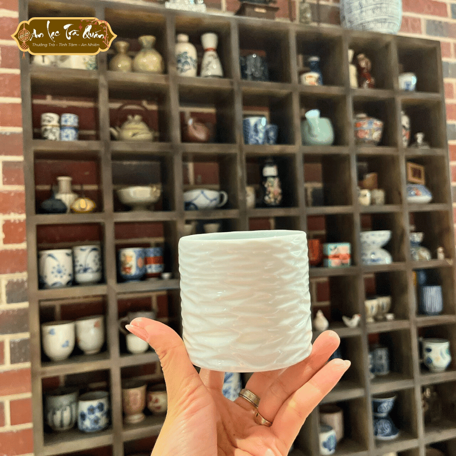 Ly Gốm Bạch Vân được chế tác từ gốm sứ trắng cao cấp, nổi bật với họa tiết vân sóng nổi trên bề mặt. Mỗi đường vân như từng gợn sóng nhỏ trên mặt nước, mang lại cảm giác tĩnh tại, nhẹ nhàng.