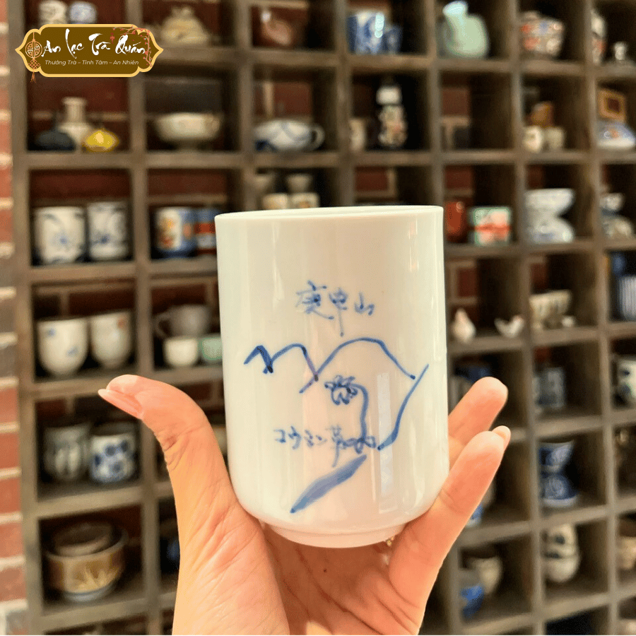 Ly Gốm Sơn Thủy với họa tiết tranh thủy mặc xanh lam trên nền men trắng tinh khôi. Mẫu ly gốm thanh nhã, phù hợp thưởng trà, cà phê và làm quà tặng sang trọng, mang ý nghĩa bình an.